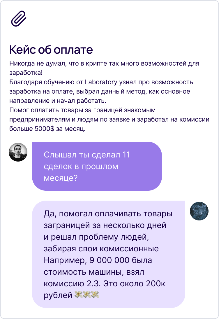 Labaratory - это отличное место для общения и обмена опытом с единомышленниками. Я получил много полезной информации и советов от опытных участников чата. Администрация чата всегда на связи и готова помочь в решении любых вопросов. Очень благодарен за возможность участвовать в таком активном сообществе!"