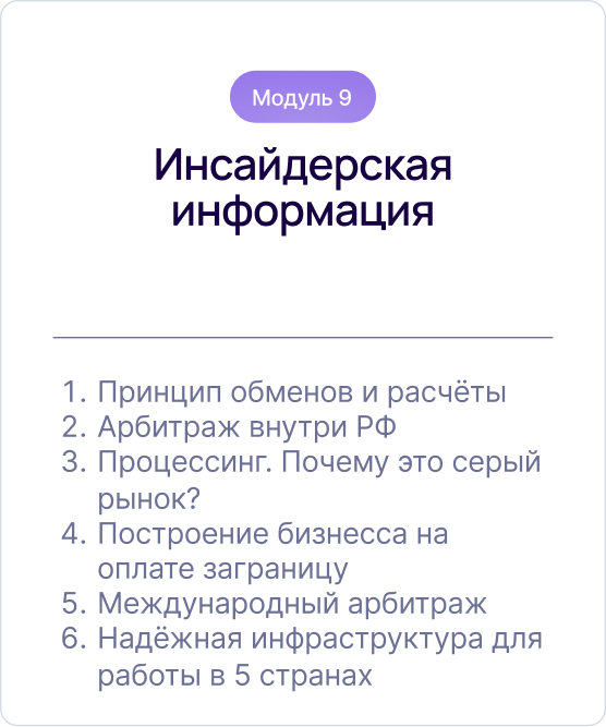 Научитесь зарабатывать на обменах и оплатах. Узнаете, как построить полноценный бизнес на помощи предпринимателям из России в оплате зарубежом. Получите доступ к надёжной инфраструктуре для бизнеса более чем в пяти странах и сможете зарабатывать на международном арбитраже